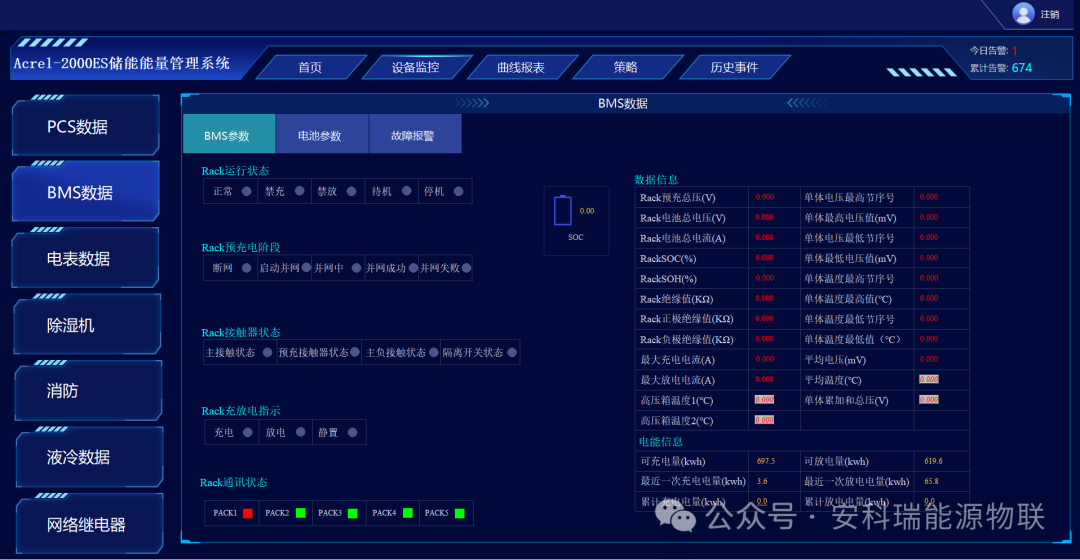 曲線報表:PCS功率曲線;SOC曲線;統計報表;歷史曲線;控制策略; 削峰填谷、需量控制、防逆流控制等;歷史事件